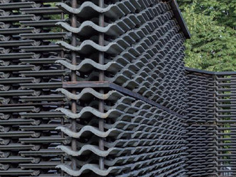 我們都知道,水泥瓦一般用作普通民房或者高檔別墅的屋頂建設(shè),但是設(shè)計師弗里達(dá)、埃斯科韋多設(shè)計的蛇形展亭,以水泥瓦建造,這種水泥瓦一般用于建造屋頂,顏色偏深而且具有獨特的質(zhì)感。展亭將水泥瓦以左右錯位、類似植物的排列方式堆疊,形成帶有墨西哥特色的鏤空墻幕。展亭的庭院中還設(shè)一個三角形的水池,屋頂?shù)紫聞t以鏡面鋪就,在日光照射